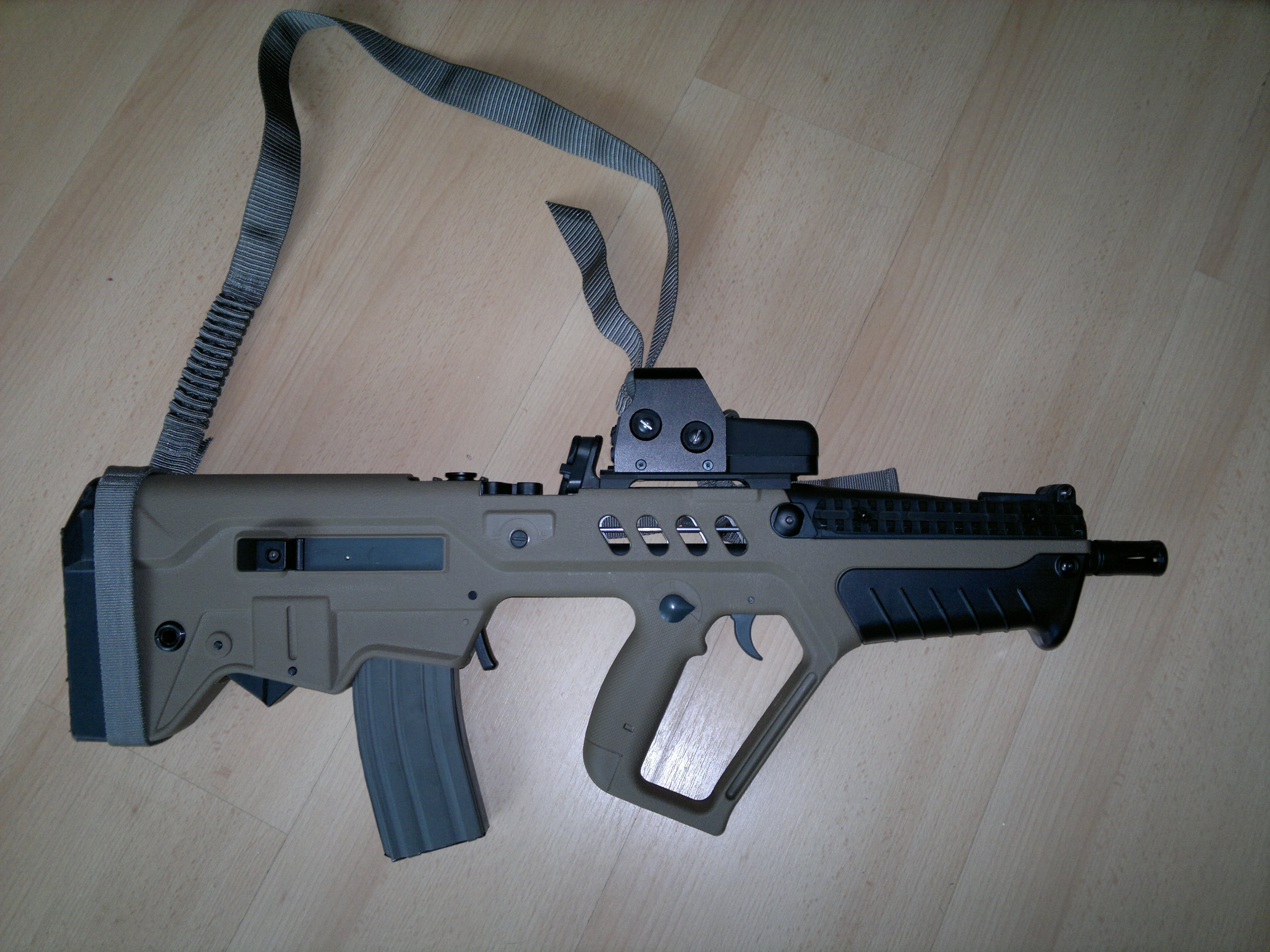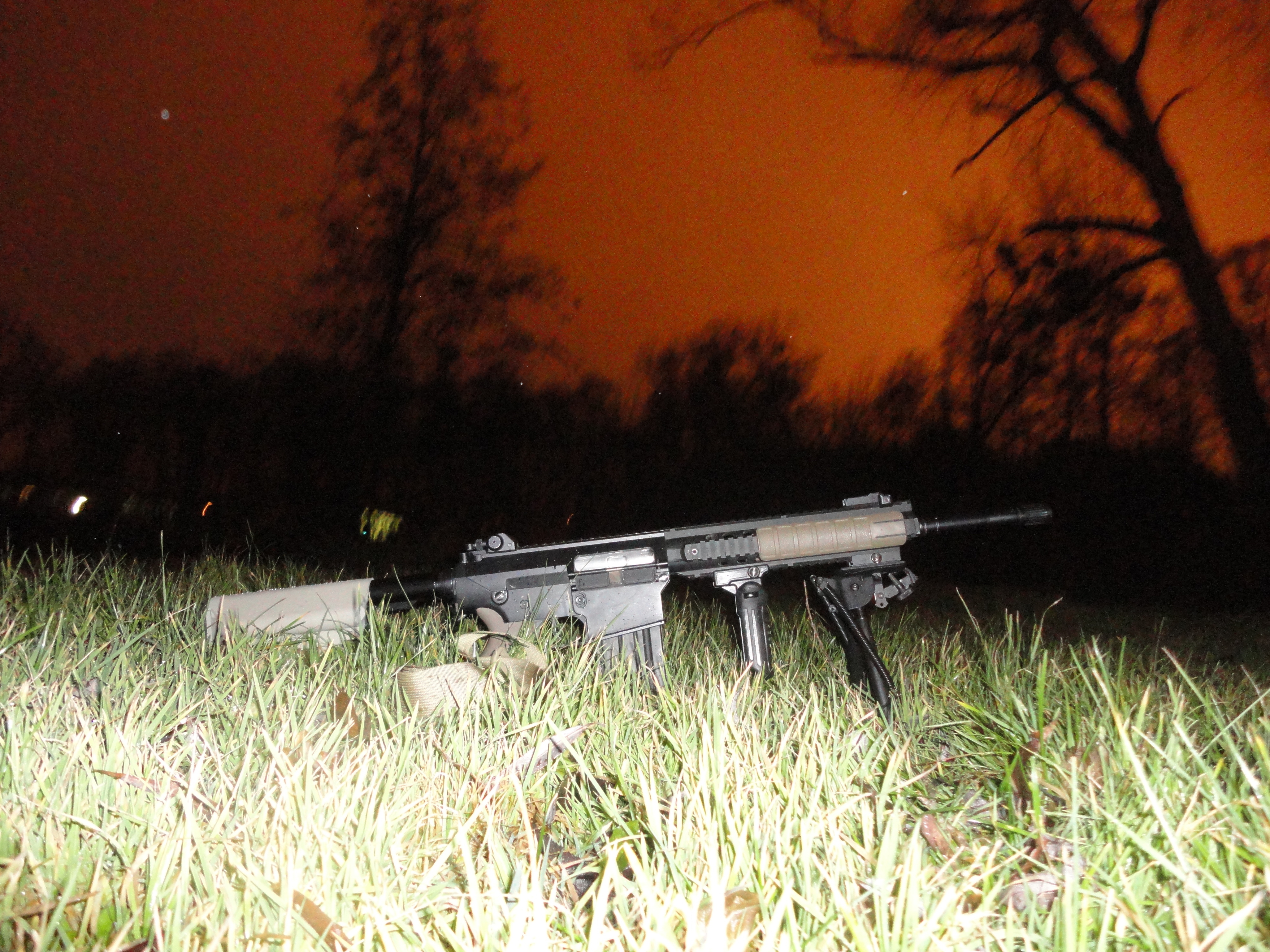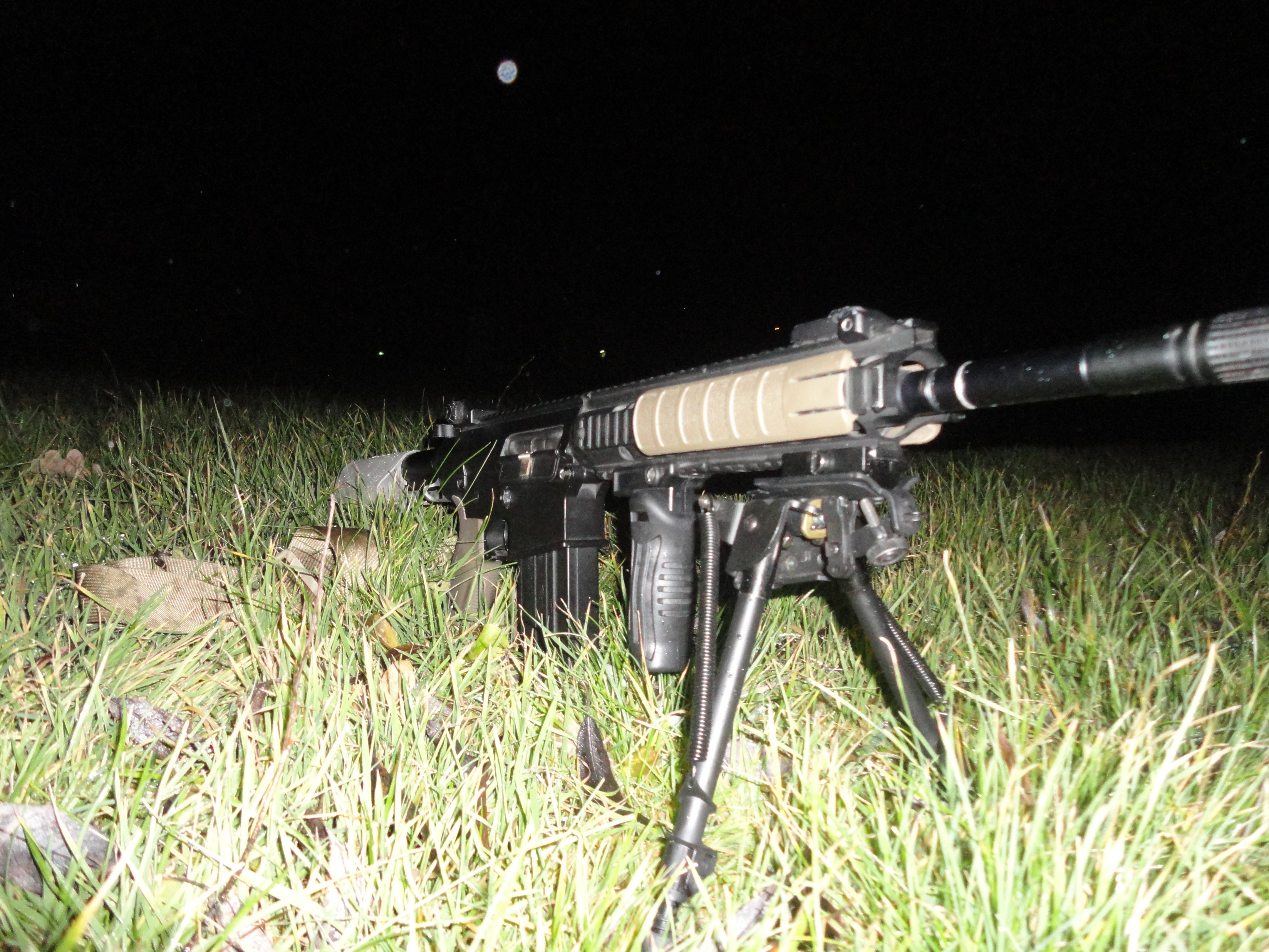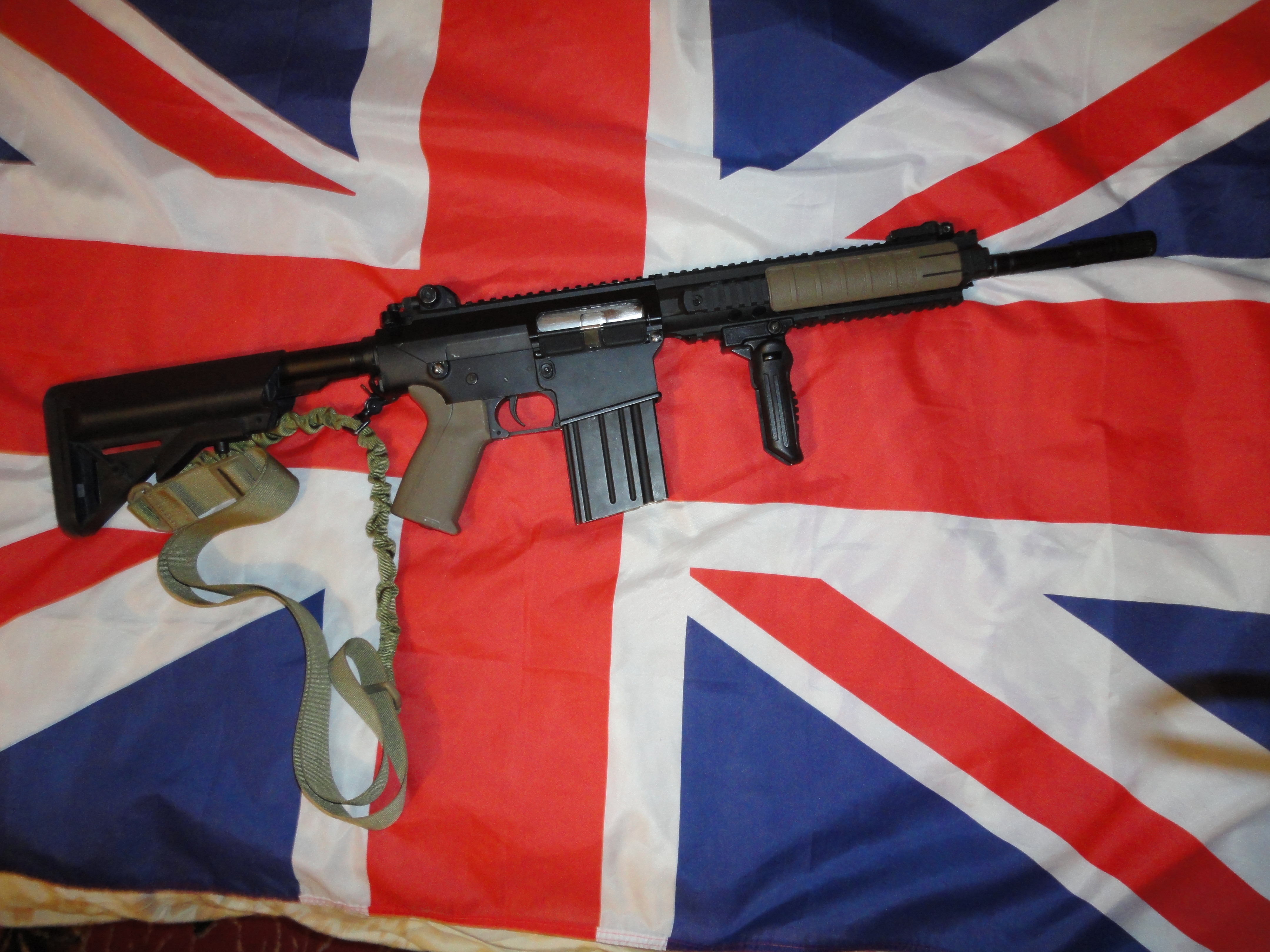 Poczynione zmiany: zamontowana kolba sf (odpowiedni kolor zostanie zaaplikowany w przyszłą sobotę), składany chwyt, chwyt pistoletowy (powinien być ergo, ale póki co jest nieco za drogi), okładziny na risie, dodatkowo zdjęty został orisowany element, który jest montowany przed szyną ris zamiast muszki. Zawieszenie 1pkt flyee.